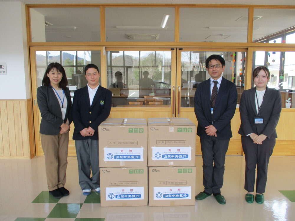 【全校】 3月18日(水)に山梨中央銀行猿橋支店の間瀬支店長が来校され、本校に再生紙から作られたトイレットペーパー400ロールを寄贈していただきました。山梨中央銀行様は、毎年、県内の特別支援学校に、それぞれの支店から贈っていただいているとのことです。学校を代表して、新生徒会役員に受け取ってもらい...