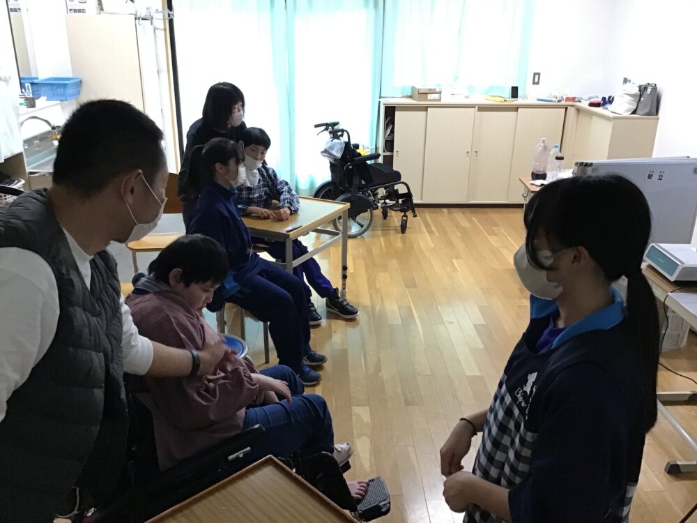 山梨県立やまびこ支援学校 > 学校活動の様子 > 3.高等部の様子 > 令和5年度 今日の一コマ!vol.45【高等部】上野原高校との交流(11月17日) 令和5年度 今日の一コマ!vol.45【高等部】上野原高校との交流(11月17日) 投稿日:2023年11月22日 最終更新日:2025年1月17日カテゴリー: 3.高等部の様子 高等部では、11月17日(金)に上野原高校との交流を行いました。 上野原高校3年生生徒23名が本校を訪れ、職業Ⅱの授業で各作業班に分かれ活動をしました。 工芸班は織物製品作り、農園班は販売準備、サービス班はカフェの接客練習、A組はマリーゴールドの花やぶどうの皮を使った染物作りを行いました。 上野原高校との交流は1学期に引き続き、今回で2回目ということもあり、お互いにすぐに打ち解け、笑顔で協力しながら作業を進める様子がみられました。 はじめの会工芸班農園班サービス班A組