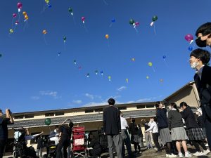 山梨県立やまびこ支援学校 > お知らせ > 令和5年度 今日の一コマ!vol.47 やまびこまつりで飛ばした風船に付けた短冊に返事をいただきました。(11月30日) 令和5年度 今日の一コマ!vol.47 やまびこまつりで飛ばした風船に付けた短冊に返事をいただきました。(11月30日) 投稿日:2023年12月1日 最終更新日:2025年1月17日カテゴリー: お知らせ 11月8日の「やまびこまつり」で飛ばした風船は、子供たちの願いや思いをのせて大空に向かって飛んでいきました。先日、神奈川県川崎市の味の素食品工場の方から、「“面接が無事終わって、就職できますように”という短冊の付いた風船が届きました。願いは叶いましたか。」と素敵なお手紙をいただきました。ありがとうございました。