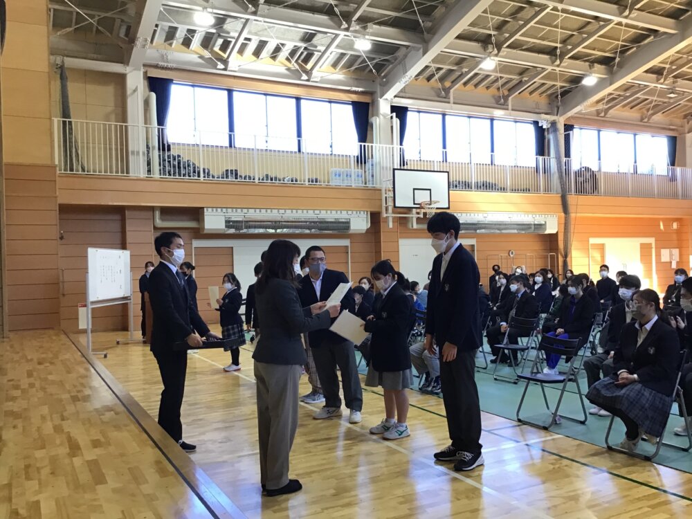 その後に行われた第2学期終業式では、校長先生のからの話を聞いたり、2学期に行われたUTY教育美術展や高等学校芸術文化祭テーマ部門応募など、学習の成果について表彰を受けたりしました。
