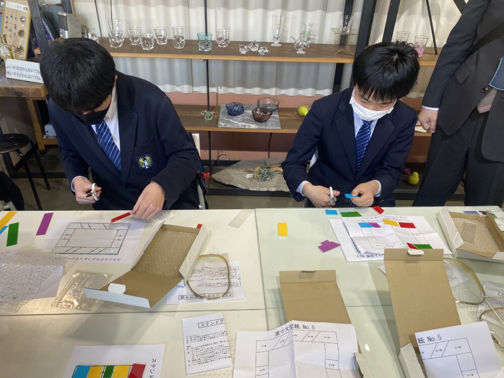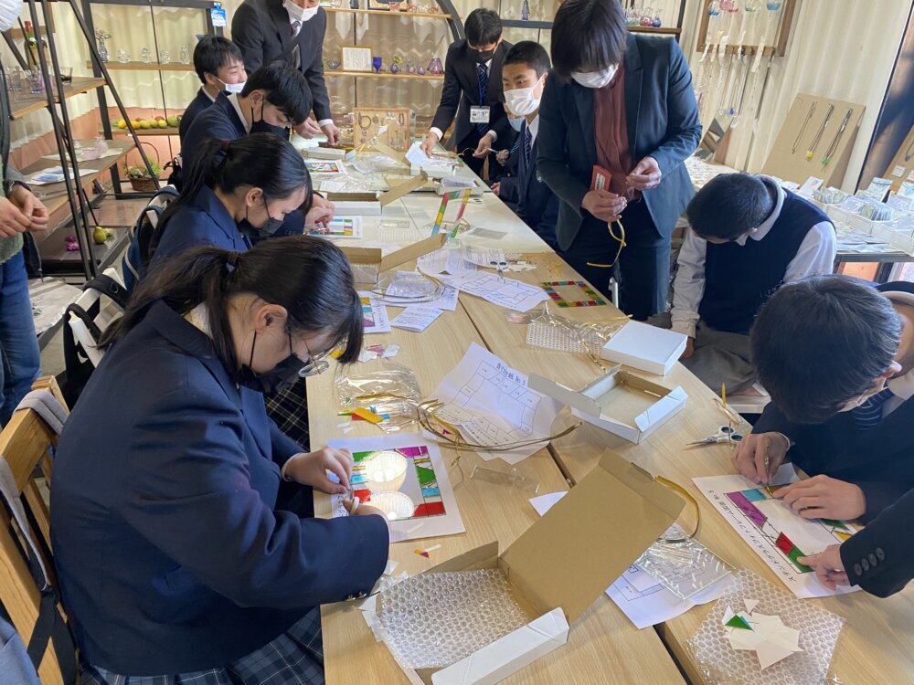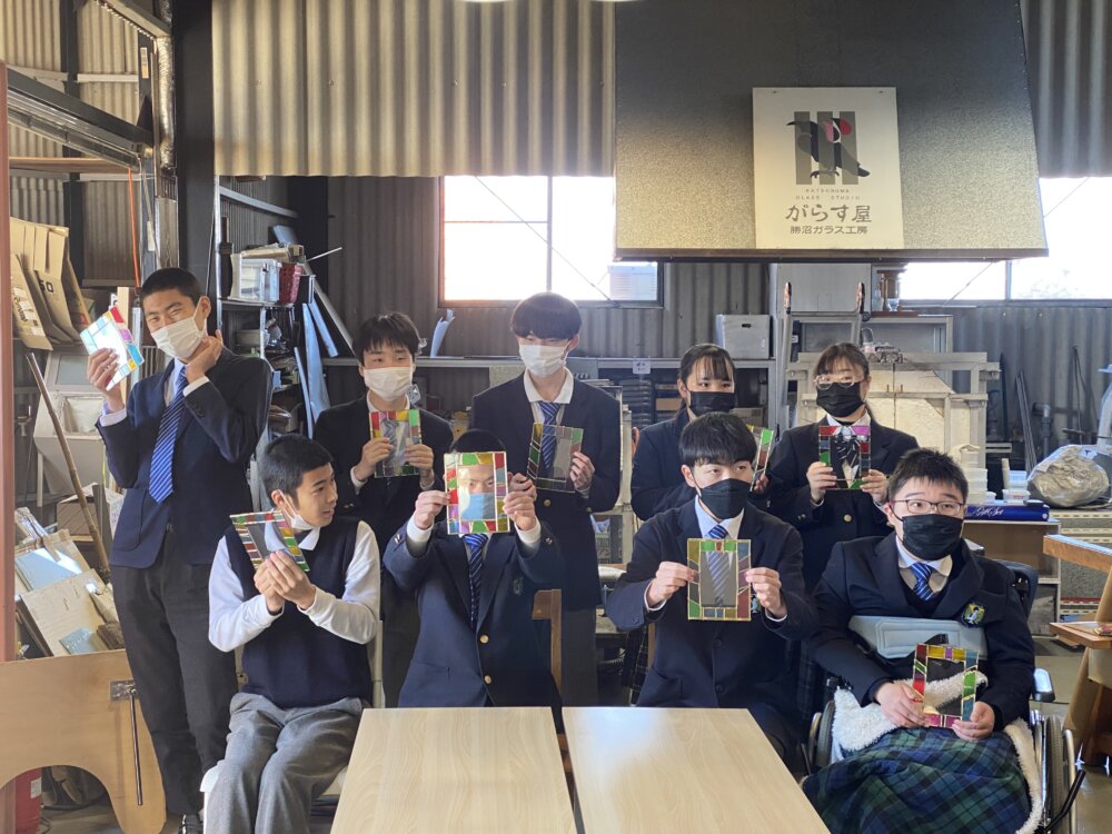 山梨県立やまびこ支援学校 > 学校活動の様子 > 3.高等部の様子 > 令和5年度 今日の一コマ!vol.56【高等部】高等部3年「総合的な探究の時間」校外学習 令和5年度 今日の一コマ!vol.56【高等部】高等部3年「総合的な探究の時間」校外学習 投稿日:2024年2月16日 最終更新日:2024年11月16日カテゴリー: 3.高等部の様子 2月13日(火)高等部3年生は最後の校外学習に行ってきました。勝沼ガラス工房がらす屋では、卒業制作としてステンドグラスフィルムを使ったフォトフレームを作りました。好きな形にフィルムを切ったり、配色を考えたりして、世界に1つの自分だけのフォトフレームが完成しました。フォトフレームには、やまびこでの思い出の一枚を入れて卒業式に展示する予定です。昼食は、レストラン・シャンモリに行きました。テーブルマナーを意識しながら、楽しく食事をしました。