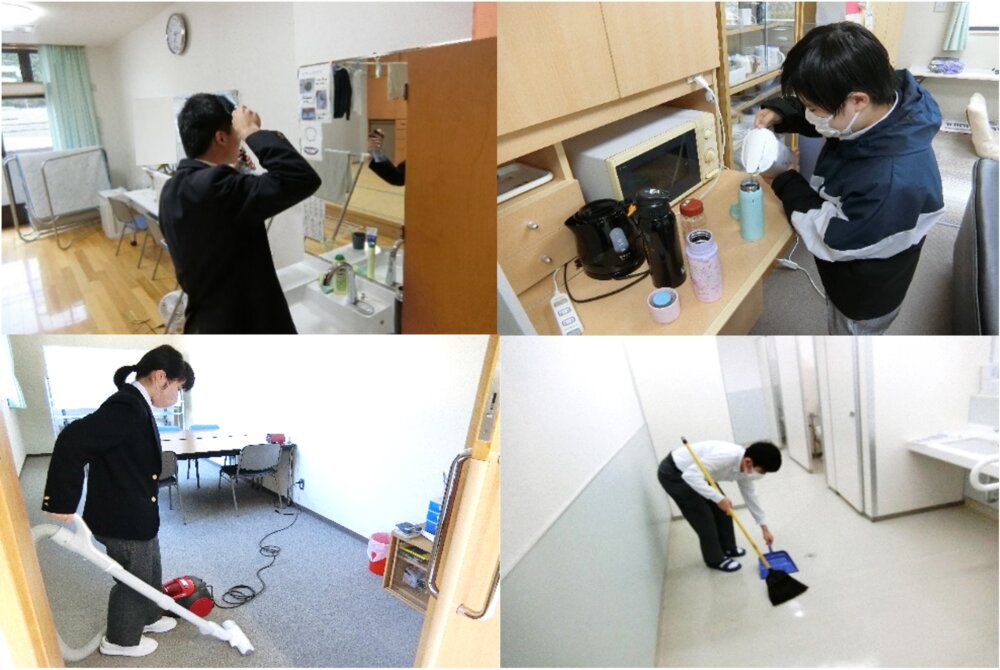 舎生は起床後すぐに身だしなみを整え、トイレや廊下など共用部分の清掃を行います。学校へ持っていく麦茶も前日に自分たちで作り、登校前に各自で水筒に入れます。そして、朝食の配膳や食堂清掃なども自分たちでしています。朝は忙しいですが、身じたくや食事準備・清掃など、みんなで協力して生活しています。