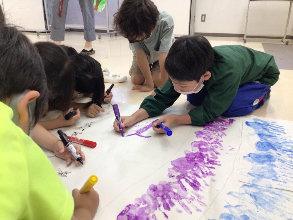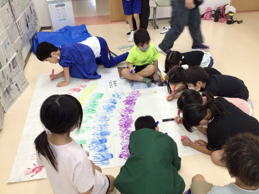 5,6年生グループは、皆で協力してやまびこ支援学校と猿橋小学校に「虹の架け橋」をかけました。大きな紙を囲んで皆で描いた作品は、壮大な思いが表されています。