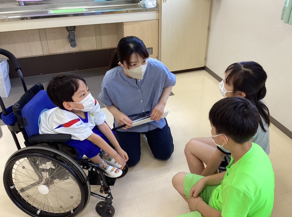 2年生グループは、学校紹介やボウリングをしました。ピンが倒れたことを喜んだり協力してピンを並べたりして、皆で楽しみました。