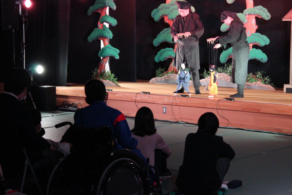 山梨県立やまびこ支援学校 > 学校活動の様子 > 学校行事 > 令和6年度 今日の一コマ!文化庁学校巡回公演〔人形浄瑠璃〕(11月21日) 令和6年度 今日の一コマ!文化庁学校巡回公演〔人形浄瑠璃〕(11月21日) 投稿日:2024年11月28日 最終更新日:2025年2月28日カテゴリー: 学校行事 「糸あやつり人形一糸座」による公演が本校で行われ、全校児童生徒が「東海道中膝栗毛」や「橋弁慶」「八百屋お七」などを鑑賞しました。「東海道中膝栗毛」では代表の生徒が実際に人形を操り共演する場面もつくっていただきまた。大月に伝わる三人遣いの笹子追分人形とは異なり、10数本の糸で人形を操る人形浄瑠璃でした。繊細な動きの中に強さや愛嬌などの感情が込められており、想像よりもずっとリアルでした。人形遣いと人形が一体となっていることに感動する子。人形に吹き込まれた命のようなものを感じながら観ていた子。江戸っ子の気質に思わず笑いが起こった子。三味線の音色に乗せて語る太夫に心奪われた子。様々な魅力を感じながら日本の伝統芸能に触れました。