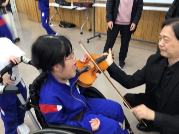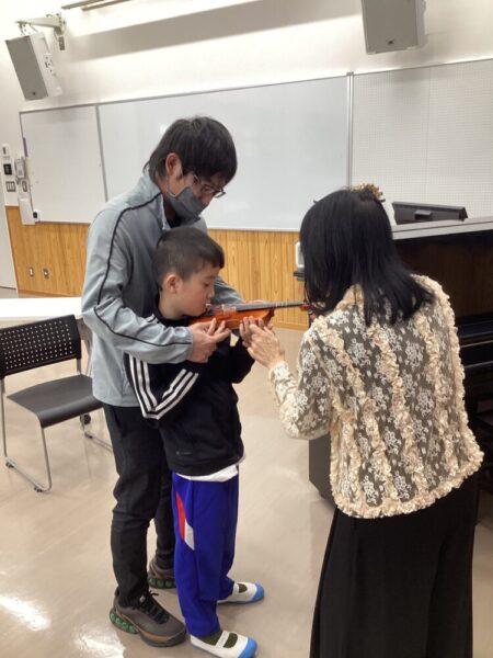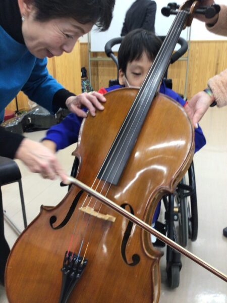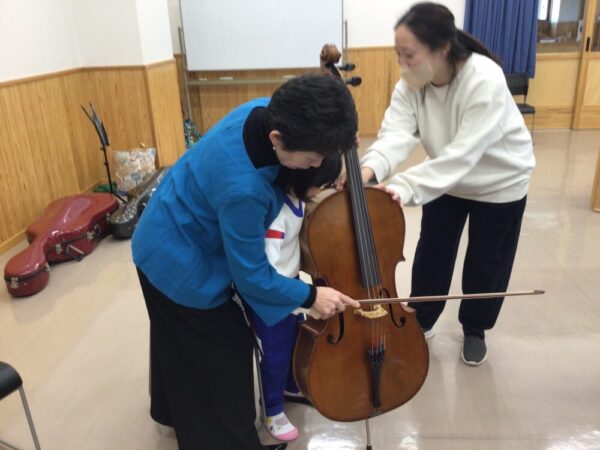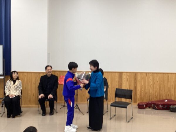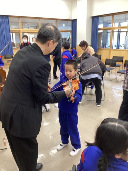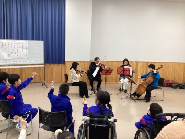 12月2日に、小学部で「芸術鑑賞会」が行われました。山梨県指導者派遣事業として「アンサンブル・デルフィーネ」のみなさんが来校し、コンサートを開いてくれました。ヴァイオリン2本、ヴィオラ1本、コントラバス1本からなる弦楽四重奏で、バッハやホルストといったクラシック音楽の名曲から歌謡曲やクリスマスソングまで幅広いジャンルの曲を演奏してくれました。児童のみんなも鈴などの楽器を手に、一緒に演奏する機会もあり、楽しいひと時になりました。演奏の最後には、本校の校歌も演奏してくださり、児童のみんなは大喜びでした。体験活動では、ヴァイオリンなどに触れることができ、貴重な思い出になりました。
