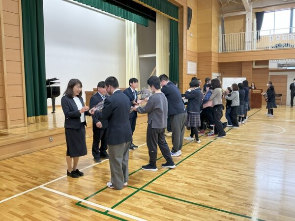 山梨県立やまびこ支援学校 > 学校活動の様子 > 学校行事 > トピックス今日の一コマ 【全校】令和7年度修了式・離退任式(3月25日) トピックス今日の一コマ 【全校】令和7年度修了式・離退任式(3月25日) 投稿日:2026年1月19日 最終更新日:2026年3月31日カテゴリー: 学校活動の様子 学校行事 【全校】 令和8年3月25日に令和7年度修了式・離退任式が行われました。各学部代表の児童生徒が修了証を校長先生から受け取り、その後、小学部の児童が指揮をして、今年度の締めくくりとして、全員で校歌を歌いました。 引き続き行われた離退任式では、離任や退職をする教職員に全校生徒でお別れをしました。新たな場所での活躍を願いながら、本校を離れる教職員に子どもたちは大きく手を振っていました。