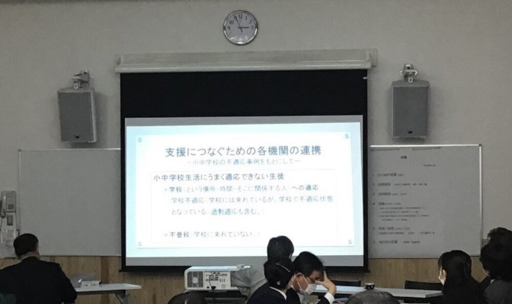 今回は、各小中学校から回答いただいたアンケート(事例)をもとに、3グループでのグループ協議が行われました。各グループでは活発な意見交換と課題の共有がなされました。そして、心理士・小林真理子先生より、「生物心理社会モデル」や早期発見の重要性などの視点から、「(テーマ)支援をつなぐための各機関の連携」について御助言いただきました。