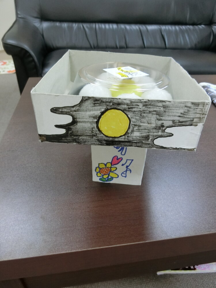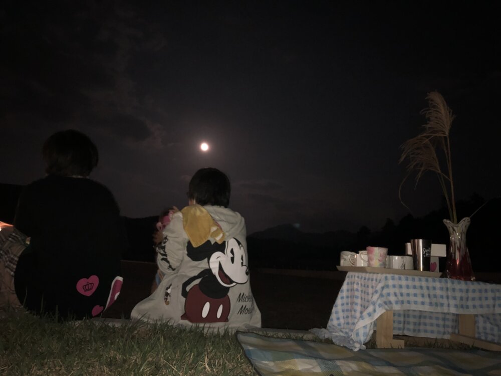 散歩でとってきたススキとお団子を飾り、外でお月見をしました。