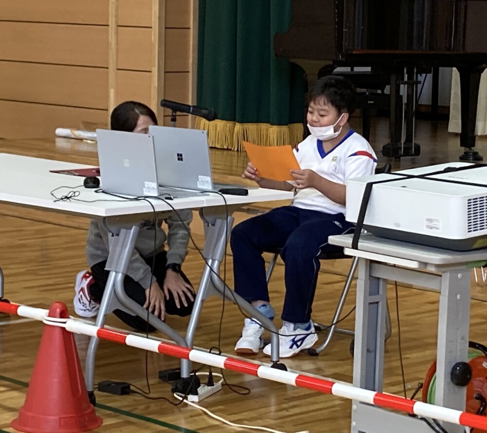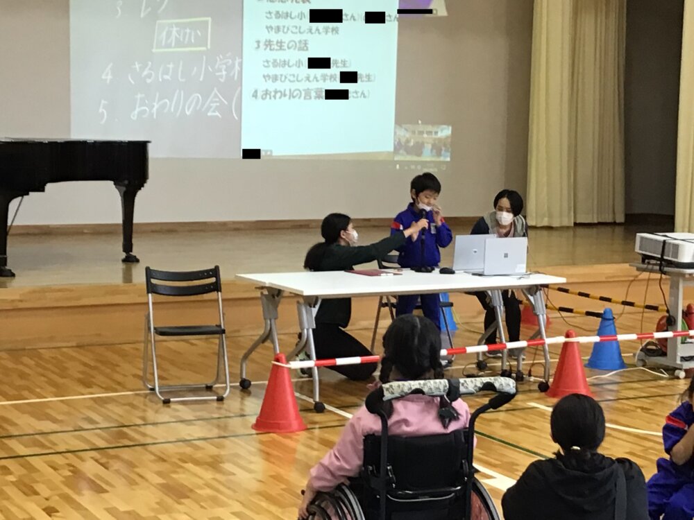 山梨県立やまびこ支援学校 > 学校活動の様子 > 1.小学部の様子 > 今日の一コマ! vol.28 小学部【猿橋小学校との交流及び共同学習】(6月15日) 今日の一コマ! vol.28 小学部【猿橋小学校との交流及び共同学習】(6月15日) 投稿日:2022年6月22日 最終更新日:2022年6月22日カテゴリー: 1.小学部の様子 やまびこ支援学校の6年生が、はじめの会を担当しました。童謡「にじ」に合わせて、両校で身体表現を行いました。おわりの会は猿橋小学校が担当し、やまびこ支援学校は感想を発表しました。