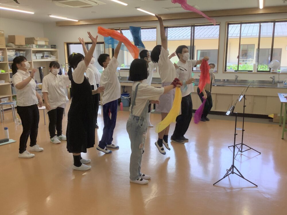 各グループで創作したリズム曲を手や足などを使って表現しました。「手びょうしの花束」