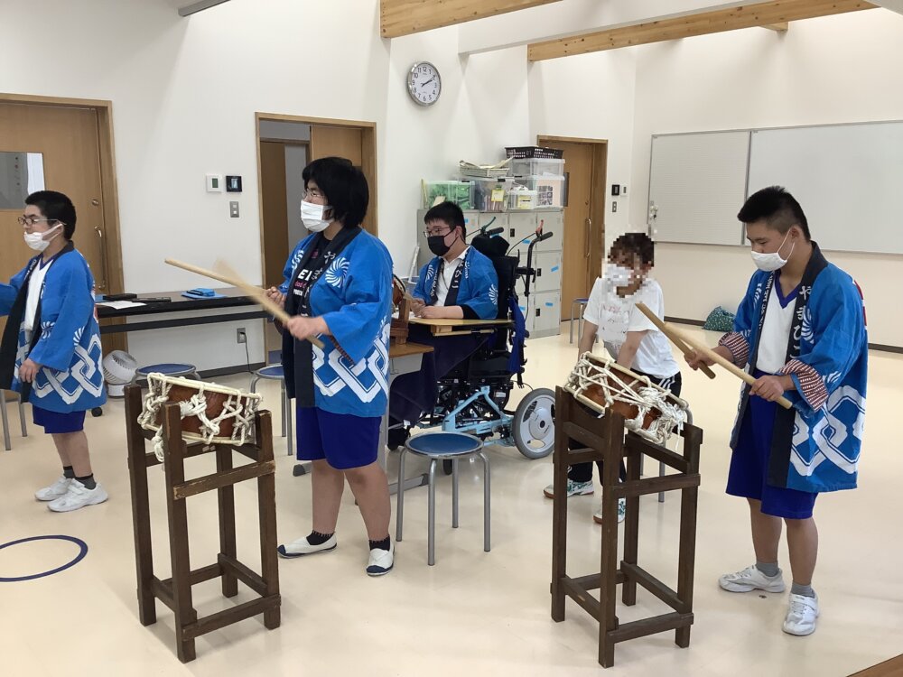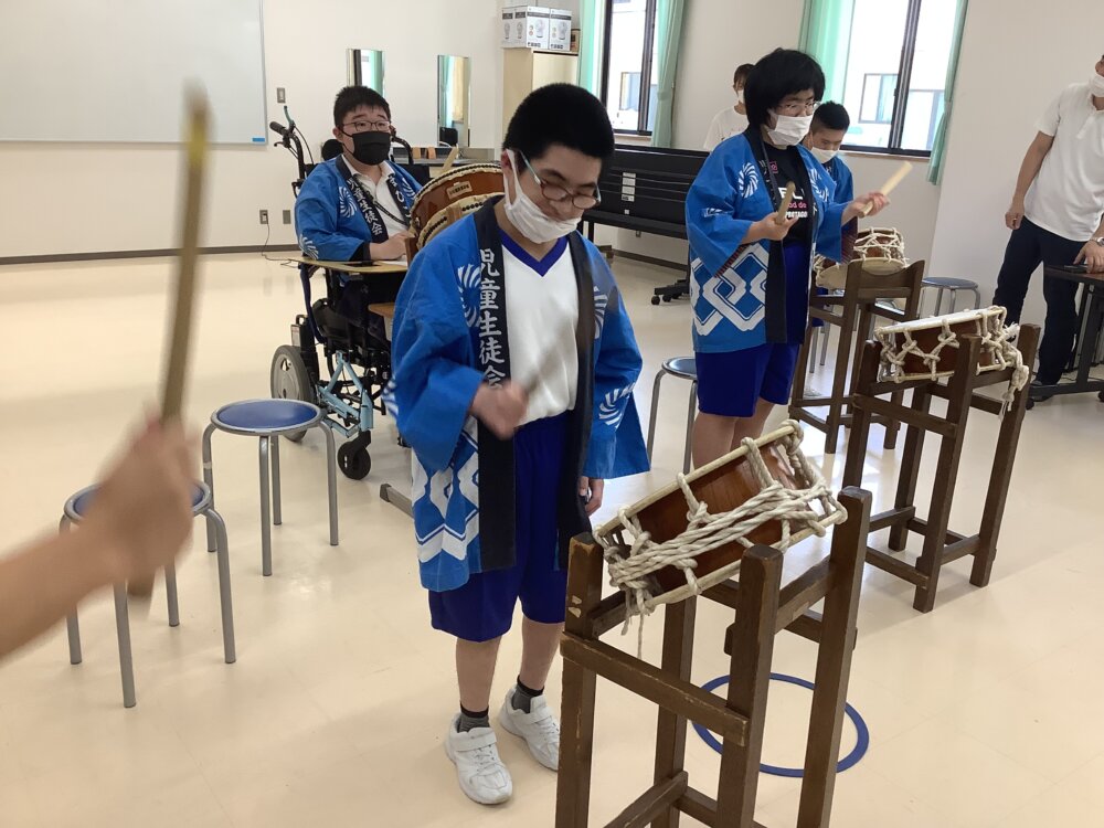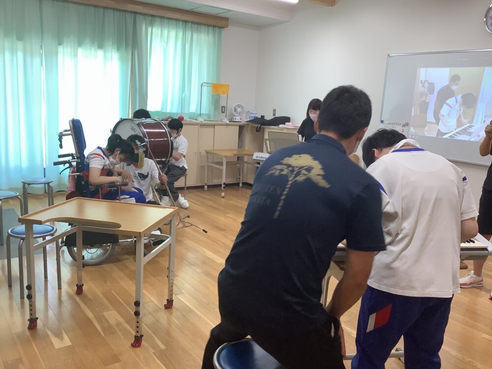 山梨県立やまびこ支援学校 > 学校活動の様子 > 3.高等部の様子 > 今日の一コマ! vol.34 高等部【音楽:発表会】(7月11日) 今日の一コマ! vol.34 高等部【音楽:発表会】(7月11日) 投稿日:2022年7月11日 最終更新日:2022年7月12日カテゴリー: 3.高等部の様子 1学期最後の授業での音楽発表会!体育館は暑いため、4つのグループが各教室に分かれてリモートで発表をしました。 A組グループ 一人一人の個性が光っていた「びっくりシンフォニー」。 Aグループ 和太鼓による演奏「島人ぬ宝」。みんなでリズムを合わせた力強い演奏でした。 Bグループ 木琴、鉄琴による演奏「カントリーロード」。 Cグループ 各グループで創作したリズム曲を手や足などを使って表現しました。「手びょうしの花束」