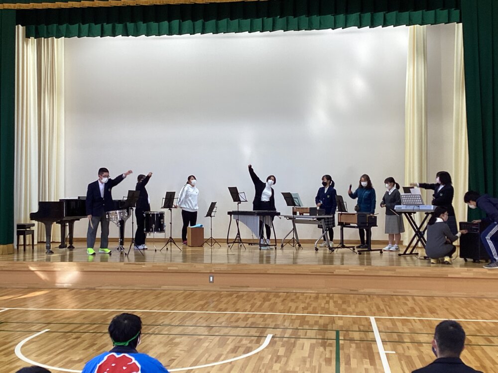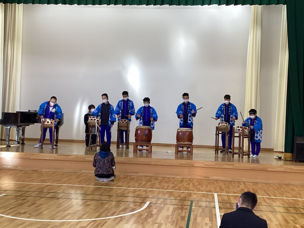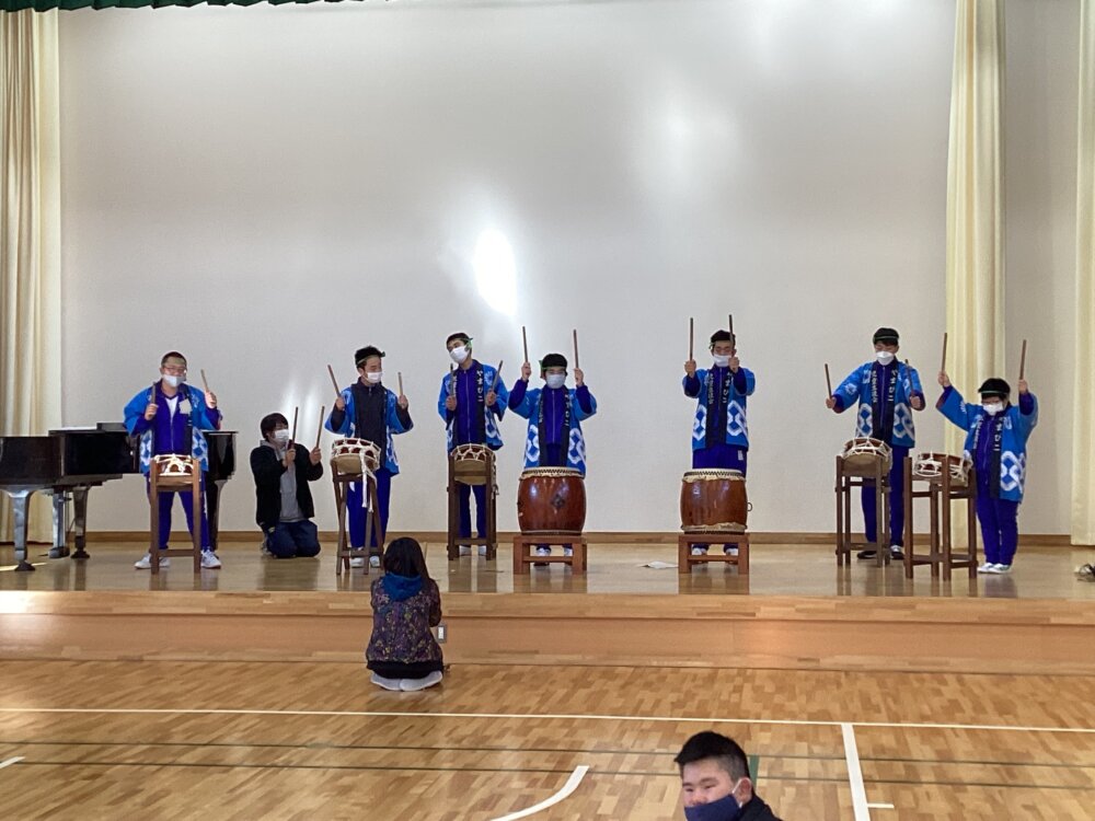 体育館で4つのグループに分かれ、2学期に学習した身体表現や和太鼓、器楽合奏の発表をしました。